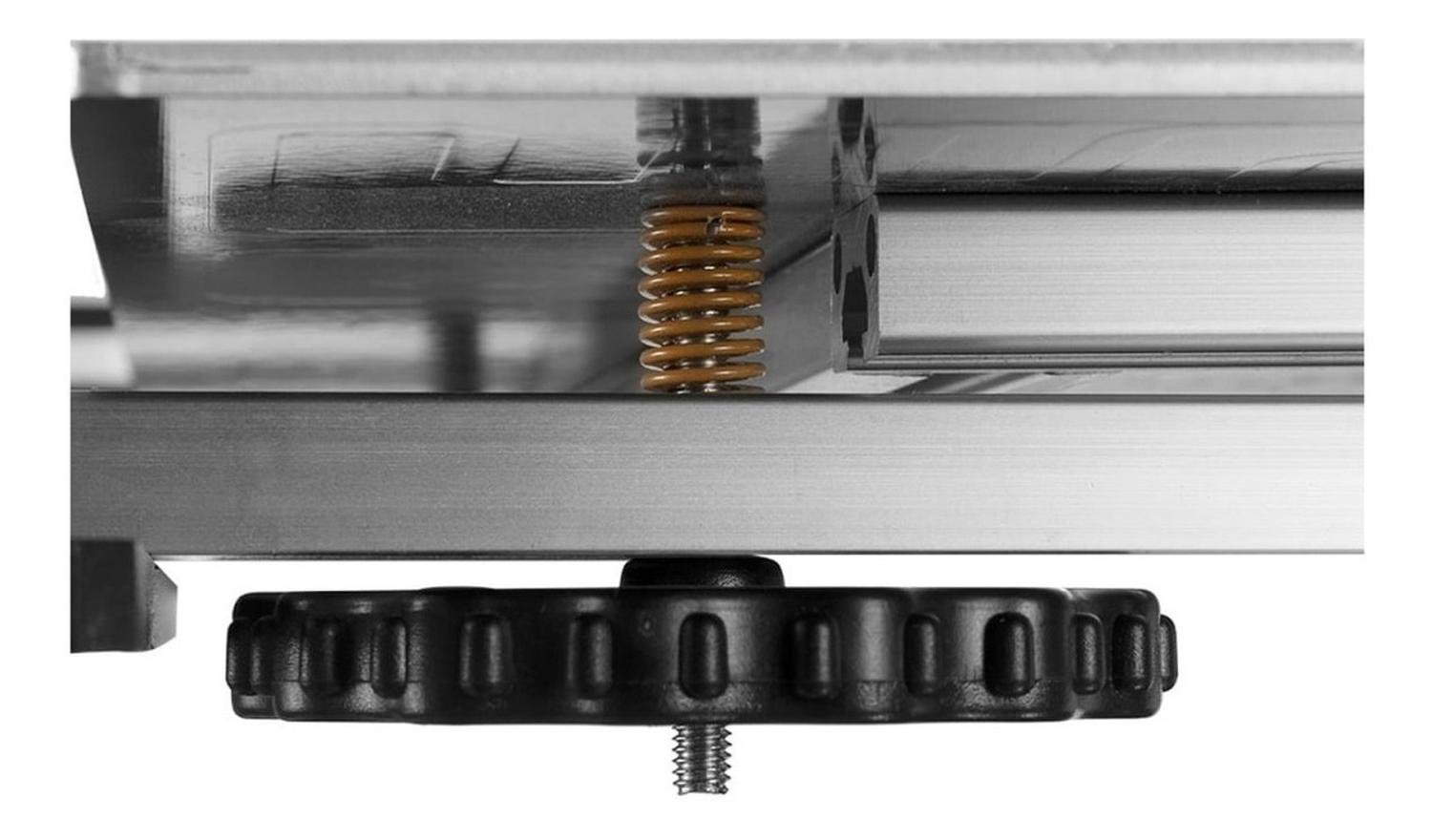 Además, la Ender 5 Plus está equipada (al fin) con un sensor de proximidad BLTouch activado por contacto de Antclabs. Bueno, al menos tres cuartas partes de la cama de impresión, ya que la sonda está montada unos siete centímetros a la izquierda del extrusor y es imposible mecánicamente medir toda la cama de impresión. Una actualización del firmware prometía ofrecer una solución a este problema, pero hasta el momento, aún no se ha resuelto, aunque es cierto que Creality lanza nuevas iteraciones muy rápidamente. Hasta entonces, volveremos a la nivelación manual de la cama. Al menos Creality ha instalado mandos giratorios grandes, lo que permite un fácil giro de los tornillos.